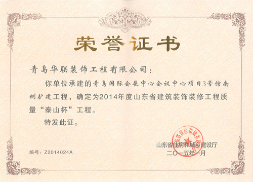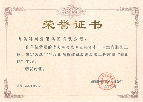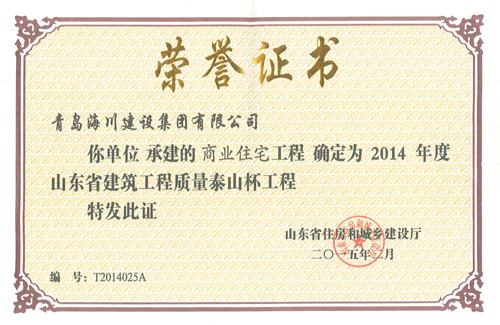 近日,公司從山東省住房和城鄉(xiāng)建設(shè)廳捧回五項(xiàng)泰山杯獎(jiǎng)證書,其中2014年度山東省建筑工程質(zhì)量泰山杯工程證書三項(xiàng);2014年度山東省建筑裝飾裝修工程質(zhì)量“泰山杯”工程證書兩項(xiàng)。